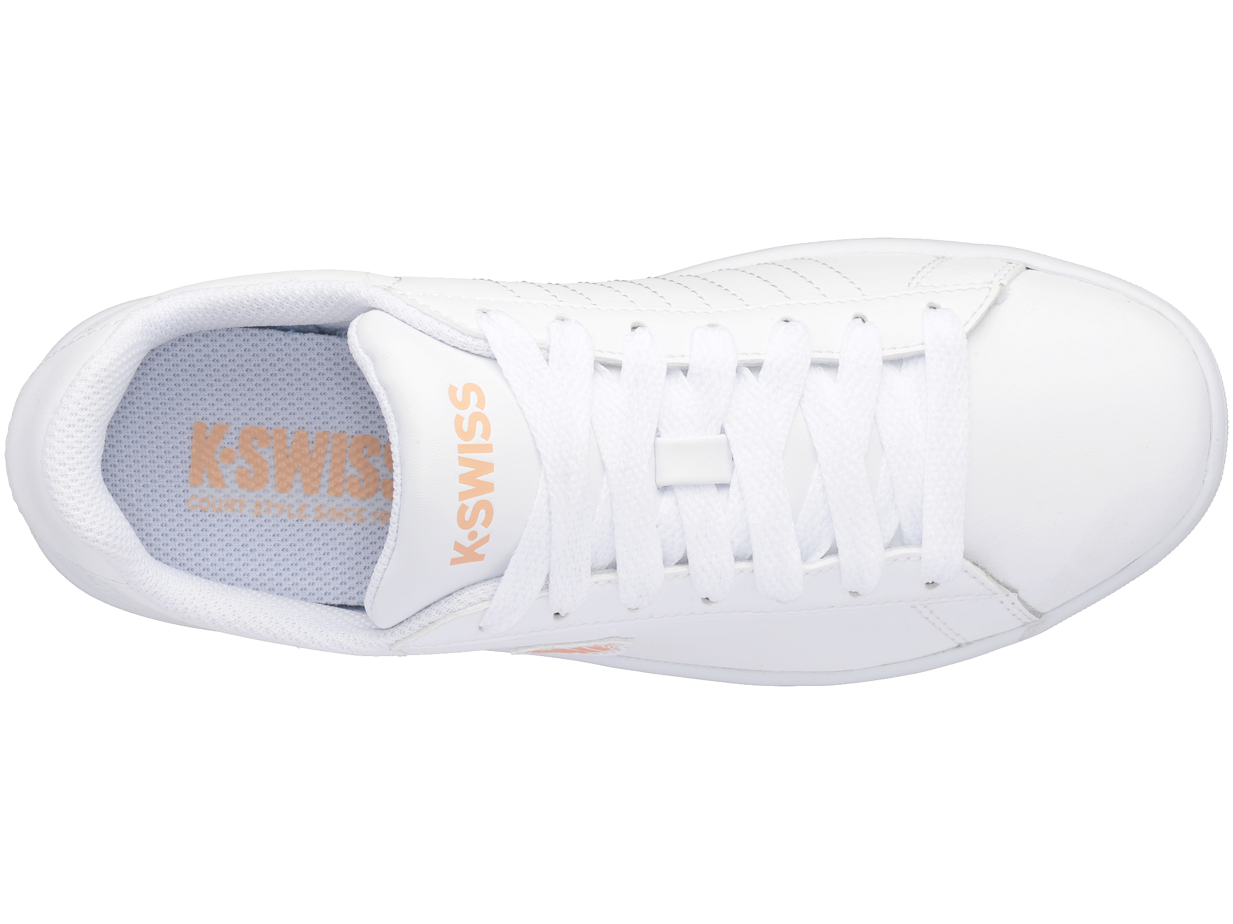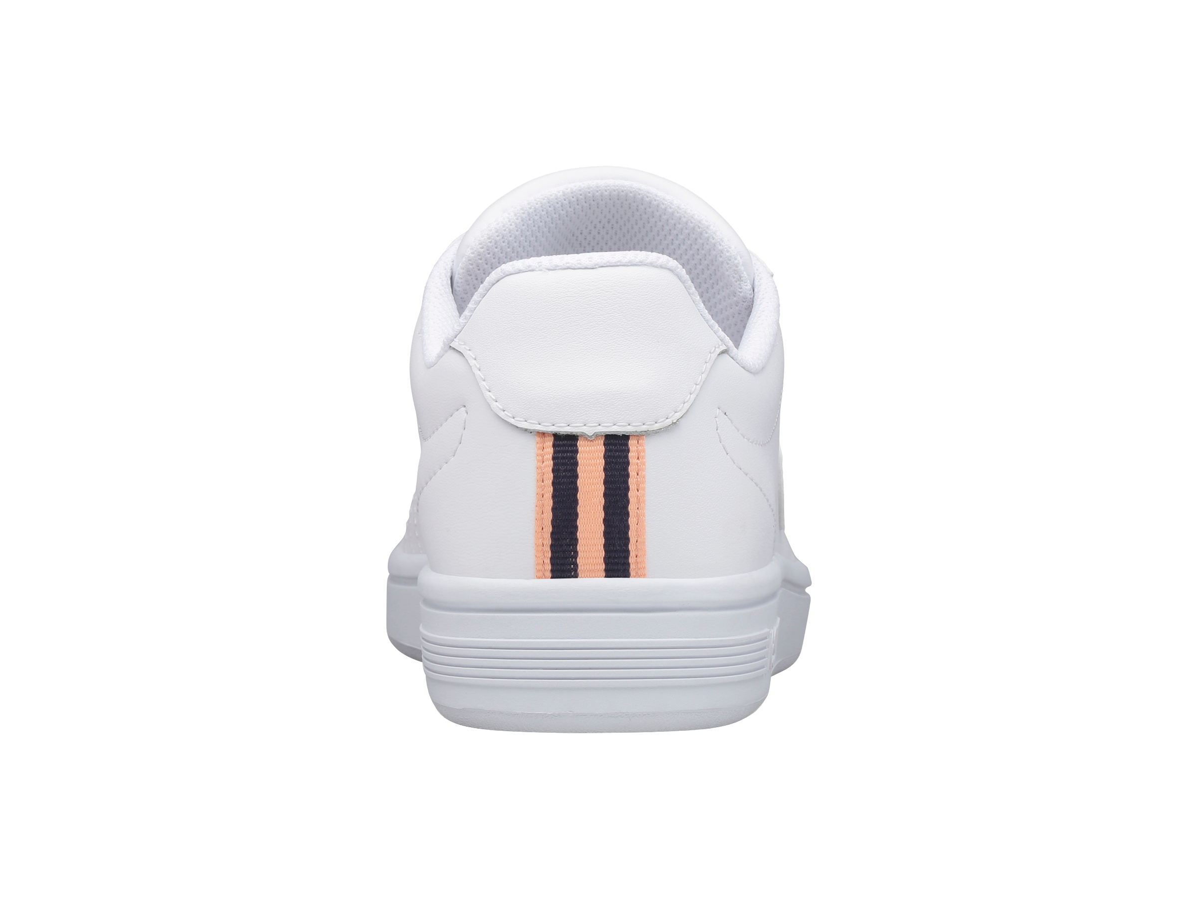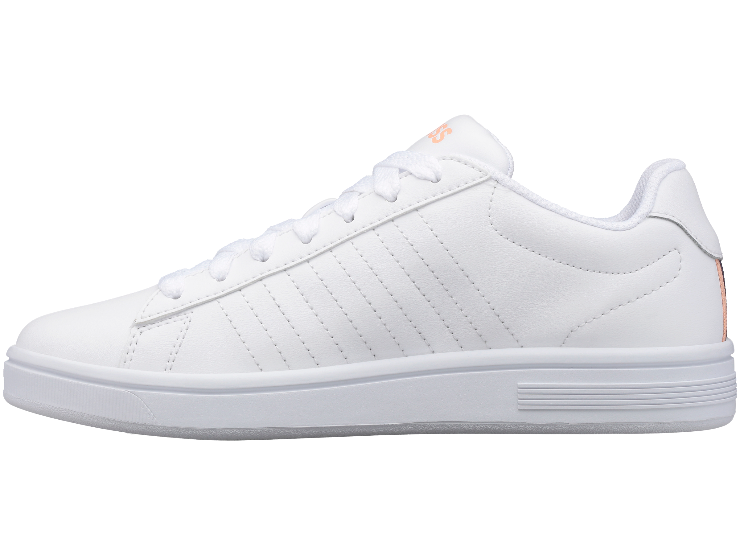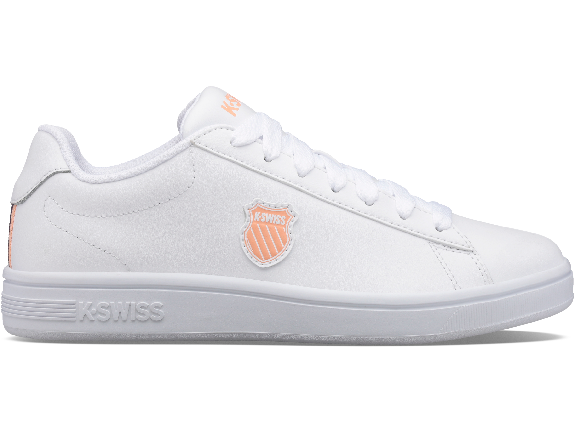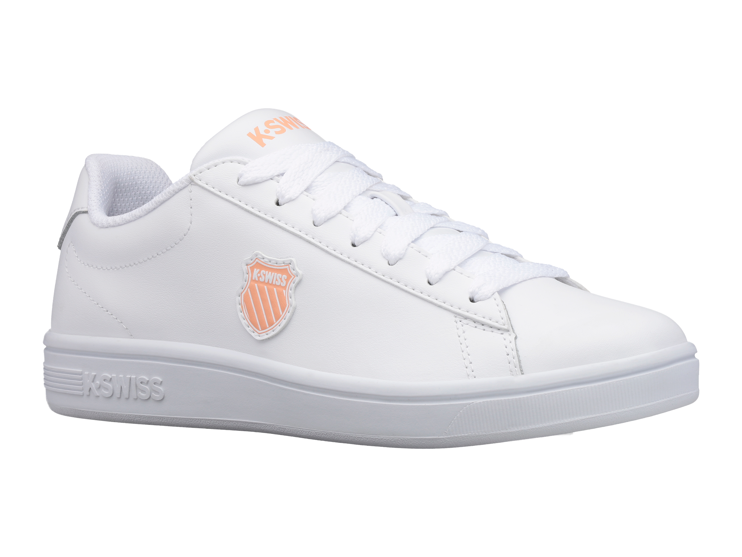 A K-Swiss classic gets a contemporary refresher with the Court Shield. Utilizing the features of the original Court Classic, this updated take offers timeless court inspiration in a versatile construction built for comfortable, everyday wear. A leather upper and modern debossed shield logo adds an elegant touch to the clean side paneling, while the deco-stitched 5-stripes augment the medial side and a nod to our classic court heritage.